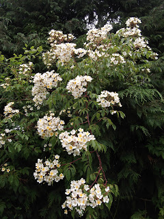 In the meantime- roses are still going strong this month- if you think of planting some nice climbers this autumn to brighten up a really boring shed or a whole row of completely yawn-inducing conifers, can I suggest this fantastic monster of a climbing rose ( also described by others as " A huge and very vigorous climbing and scrambling rose", the " Kiftsgate". I grew this monster about three years ago in a group of huge conifers which were drab and plain, and it's such fun to sit and watch per day almost and see this rose climbing up in it, and covering the trees with swathes of white tiny pretty flowers..